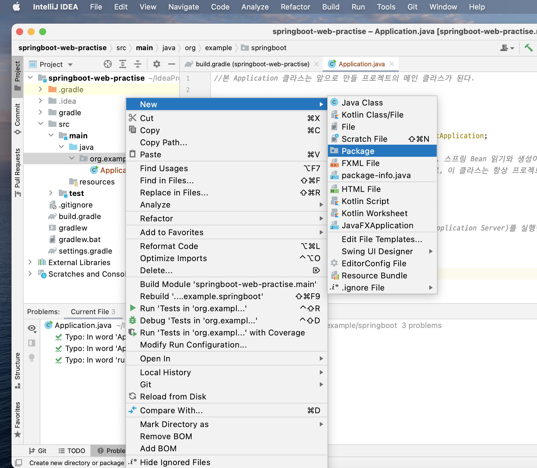 패키지를 생성할 때 기본으로 주어지는 org.example을 사용했으므로, 뒤에 현재 프로젝트명인 springboot를 붙여서 org.example.springboot로 패키지명을 정했다.
