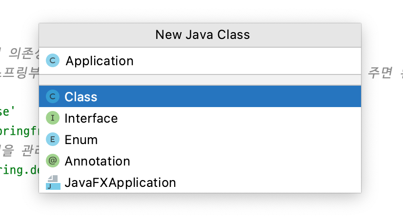 위의 과정과 마찬가지로, 패키지를 우클릭한 후, New -> Java Class를 선택하면 된다. 클라스 명은 Application이라고 하였다.