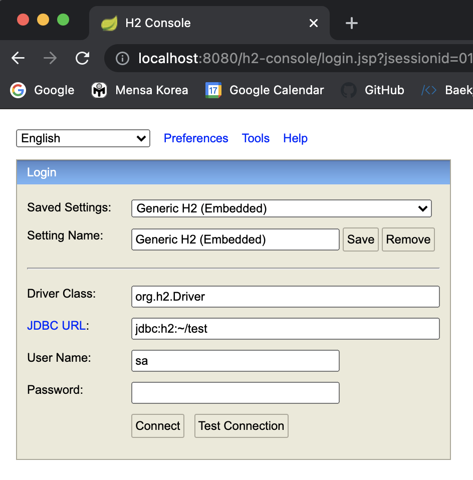 웹 브라우저에서 http://localhost:8080/h2-console 로 접속하면 h2의 웹 콘솔에 접근할 수 있다.