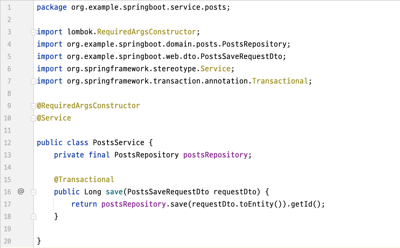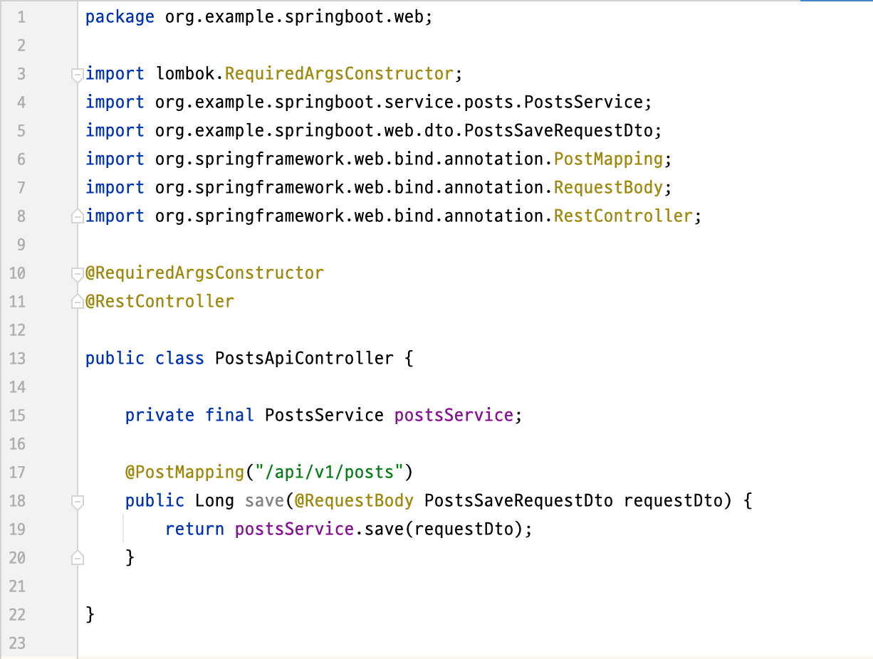 그리고 생성자는 @RequiredArgsConstructor가 해결해 준다. final이 선언된 모든 필드를 인자값으로 하는 생성자를 lombok의 @RequiredArgsConstructor가 대신 생성해 준다.