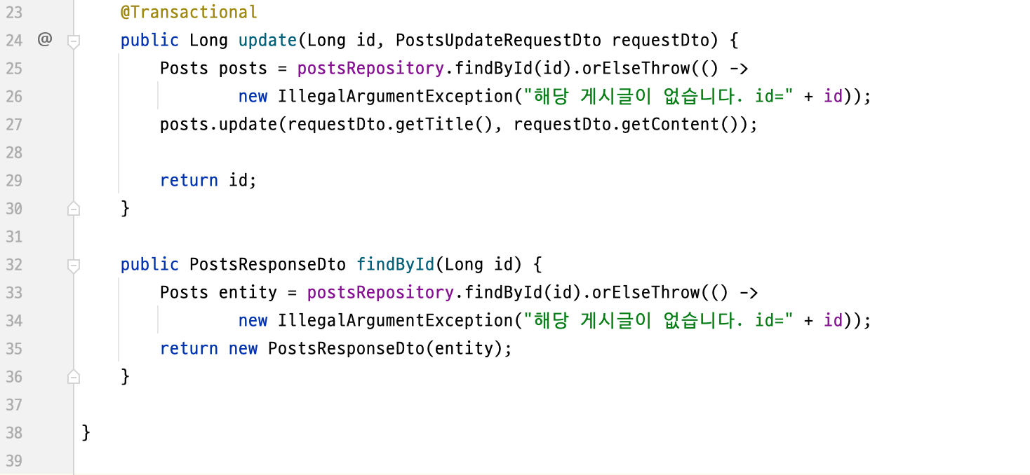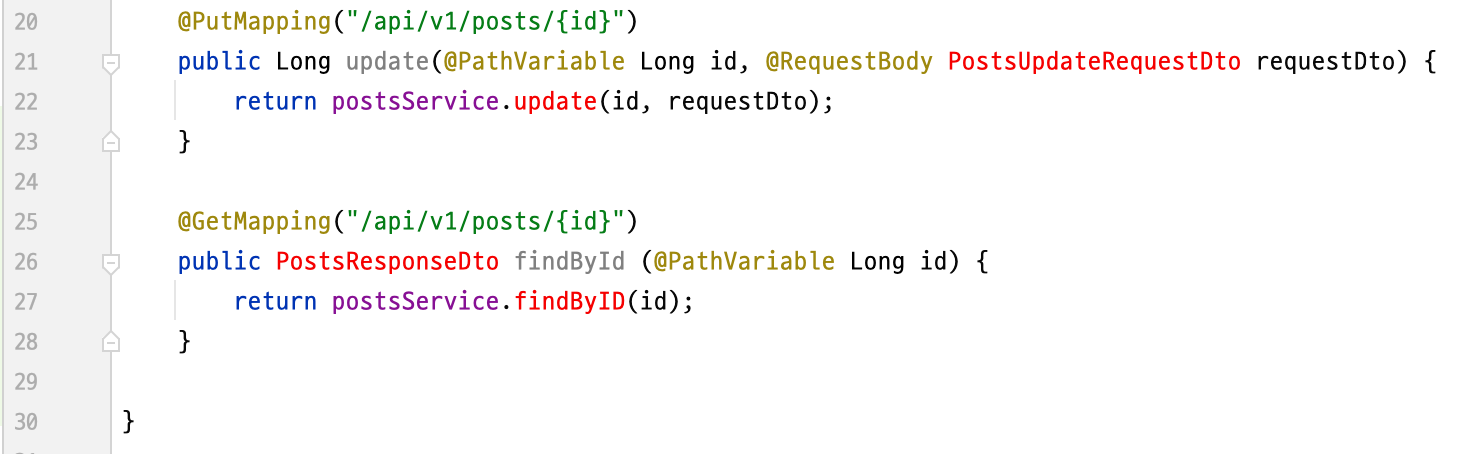 PostsApiController, Posts, PostsService에는 내용을 추가하고, web/dto 아래에 PostsResponseDto, PostsUpdateRequestDto 클라스를 추가 후 작성하자.