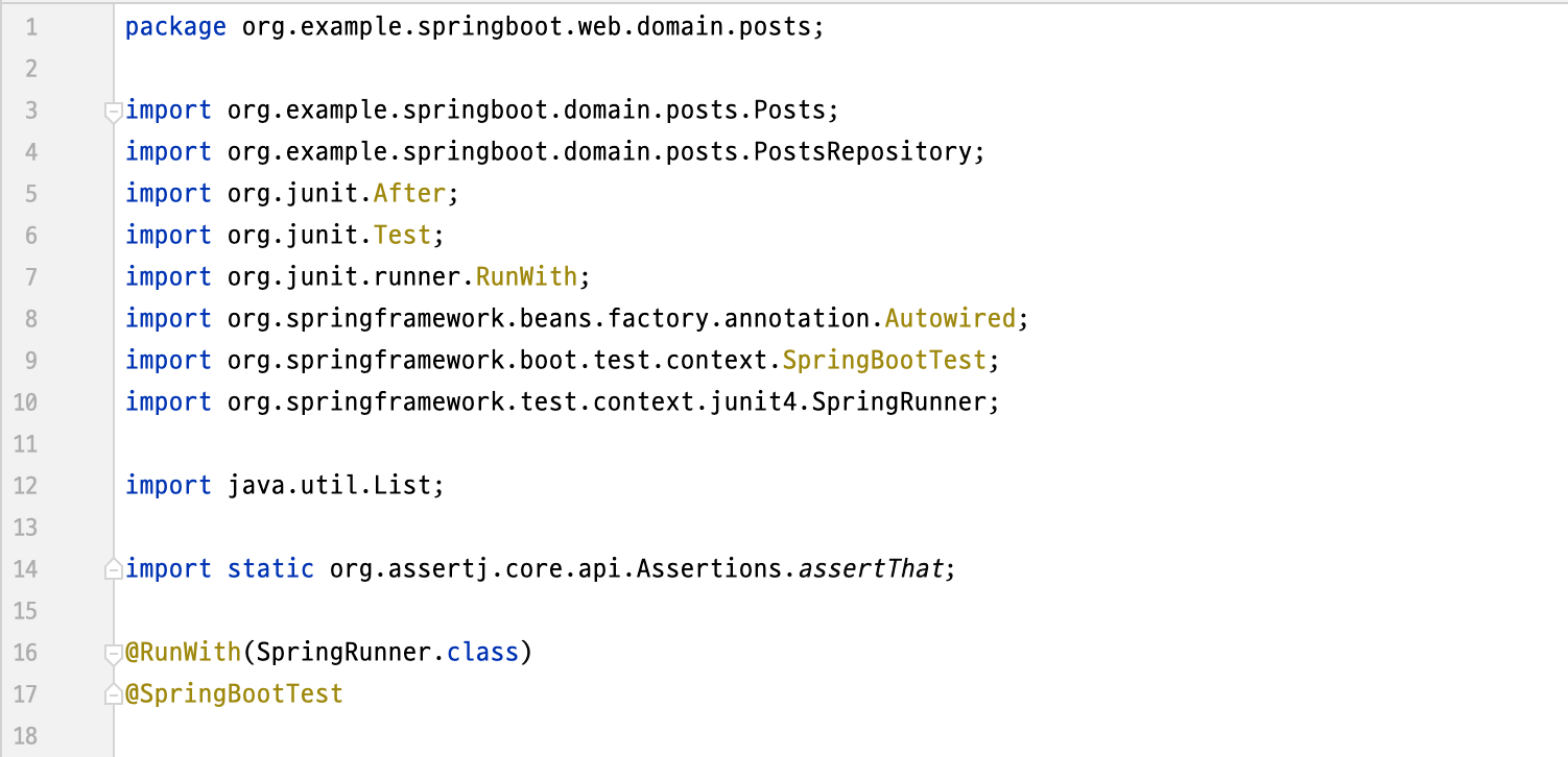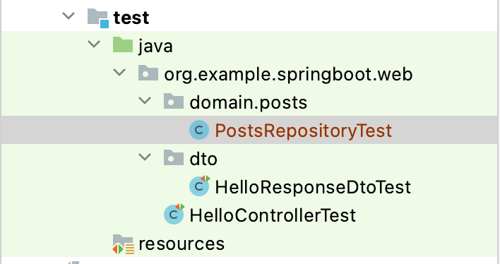 test 디렉토리 아래에 domain.posts 패키지를 생성하고, 테스트 클라스는 PostsRepositoryTest라고 하자.