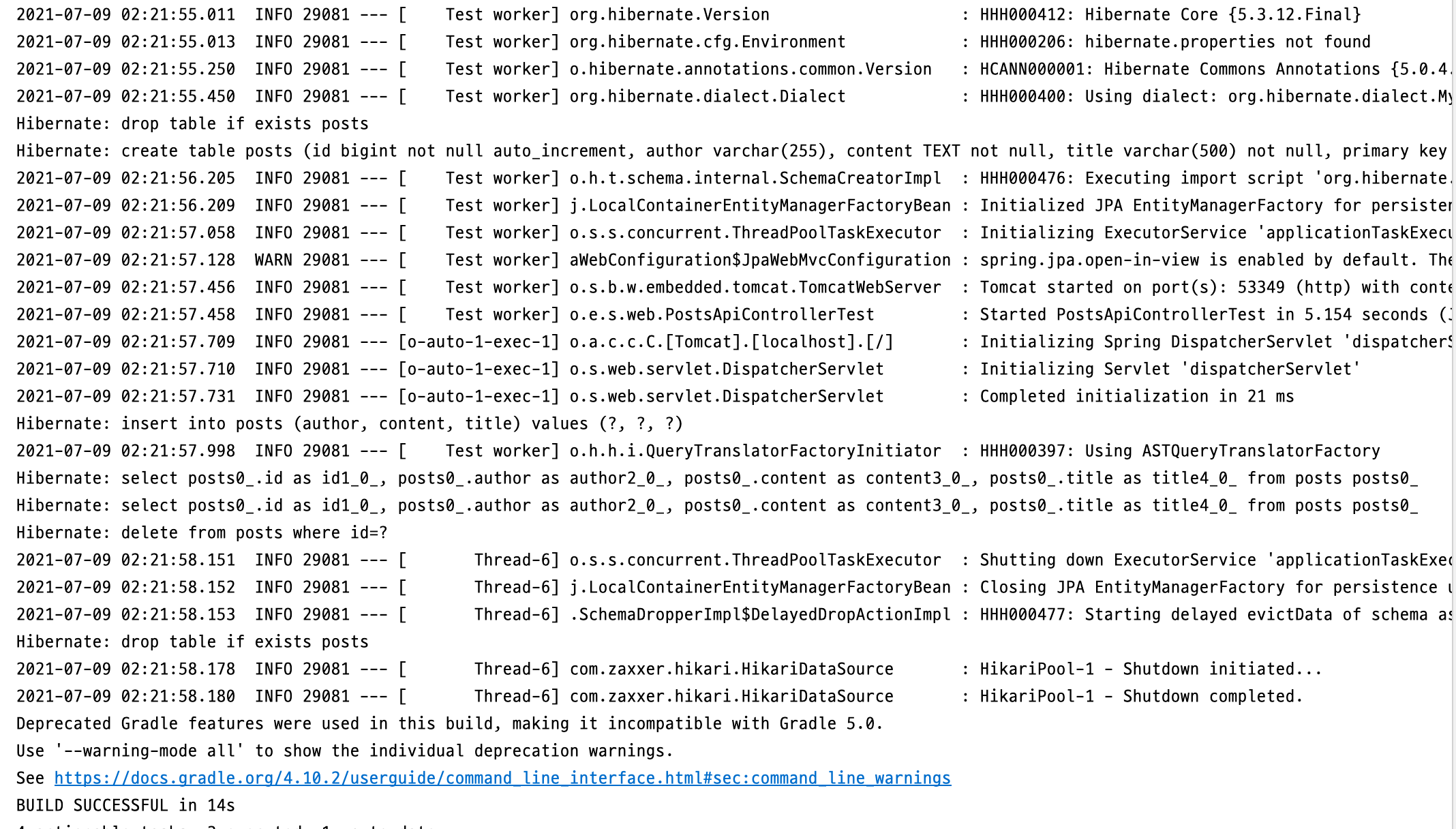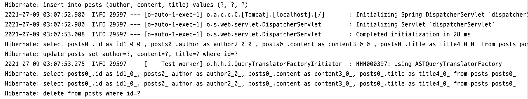 WebEnvironment.RAMDOM_PORT로 인해, Tomcat이 랜덤 포트에서 실행되었고, insert 쿼리가 실행된 것을 로그를 통해 확인할 수 있다.