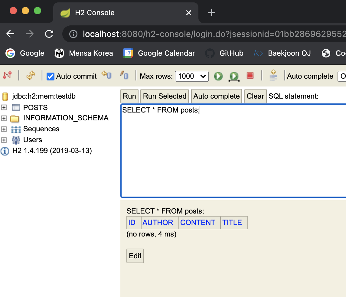 다음과 같이 좌측에 POSTS 테이블이 정상적으로 노출되어야 한다.