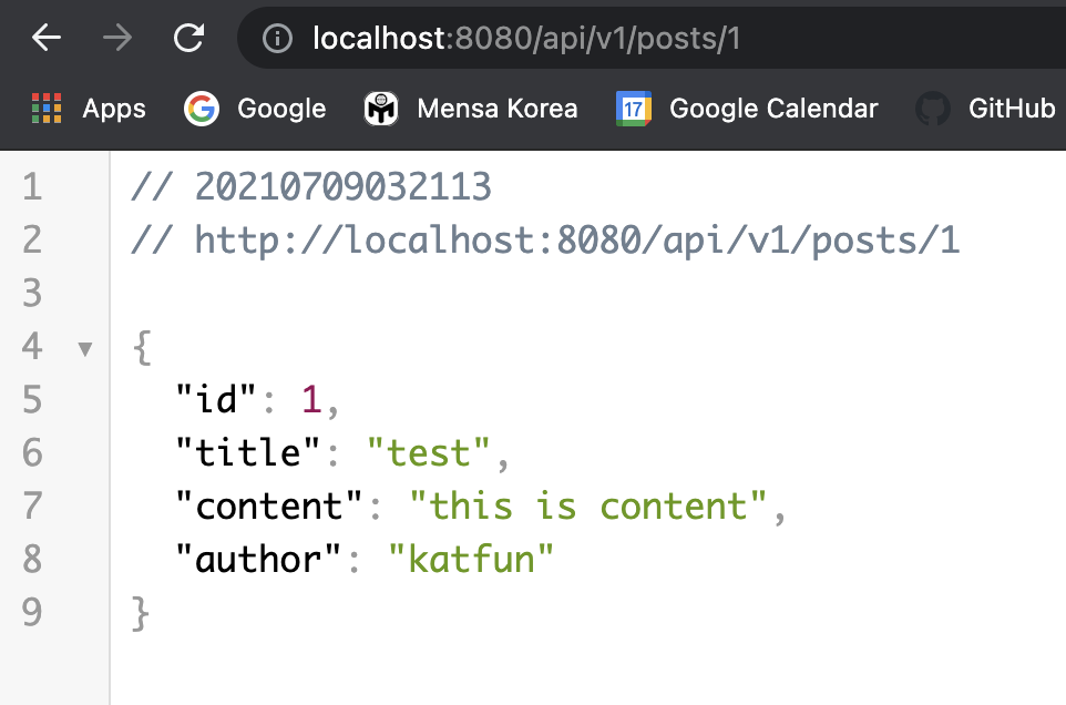 브라우저에 http://localhost:8080/api/v1/posts/1 을 입력해 보자.