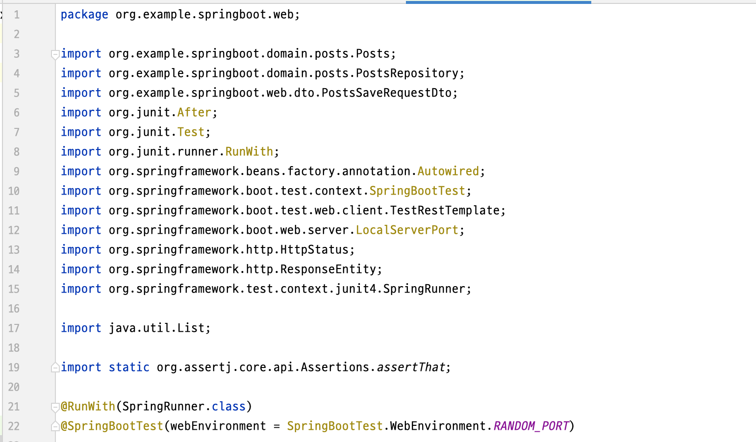 테스트 패키지 중 web 패키지에 PostsApiControllerTest를 생성하고 다음과 같이 입력한다.