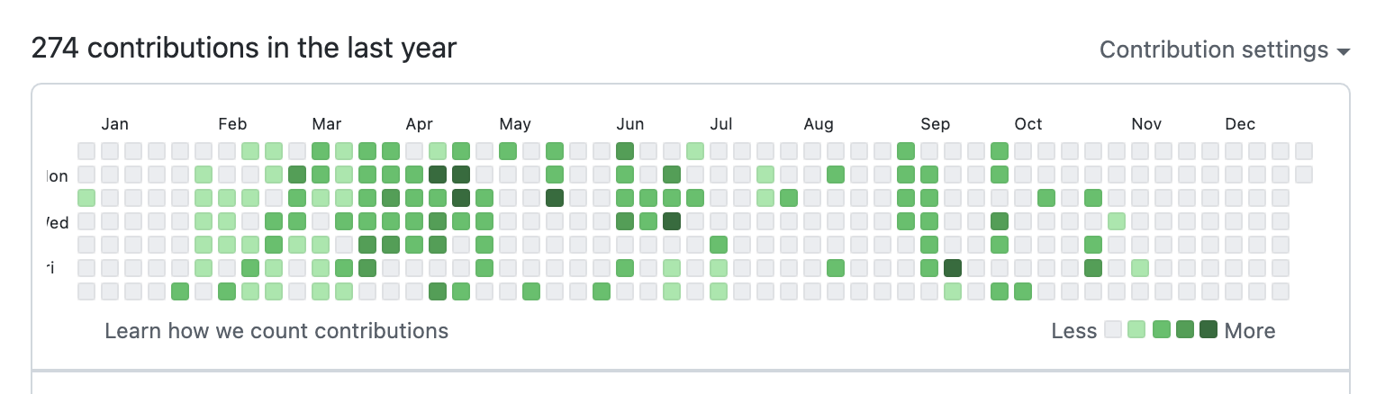 흔히 잔디를 심는다고 하는, GitHub에 1일 1커밋하기는 하지 않았다. 이런 목표를 세우면 공부를 했다는 표시의 커밋이 아니라, 커밋 그 자체가 목적이 되는 주객전도 상황이 될 것을 알았기 때문이다.